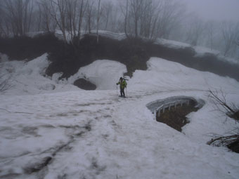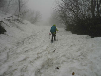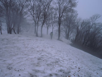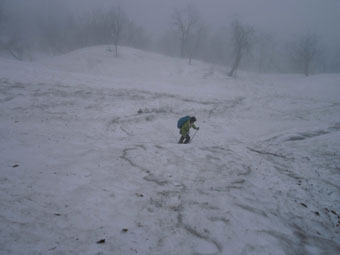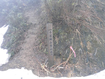 しばらく行って、雪の着いている所から登った。 |
