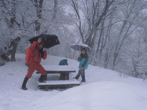 東種から雨が雪に変わり、登山口に近付くと、いっぺんに雪量が増え、車はその手前にデボして登り始めた。スノーシューやカンジキは、全く考えなかったので、少々後悔したが、歩き始めて、その必要が無いと思い始めた。ずっと、雪は降り続いていたが、雪量の少なさは、この山も同じであった。