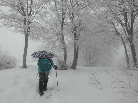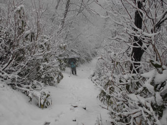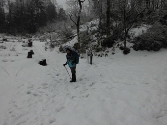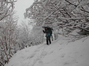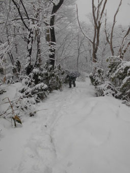 しんしんと降る雪中を、歩くのも乙なものである。雪山の雨やミゾレは厄介であるが、雪上に重ねるが如くであるからして、抵抗感が少ない。お天気の中を歩くに越したことはないが、それでは、歩く機会が少なくなってしまうのである。千石城山に辿り着いた途端、「城ヶ平山に行くか?」 との問いかけに「山ノ神」が頷き、すぐに決行となる。