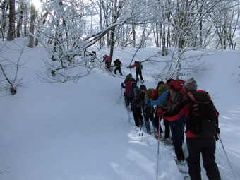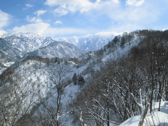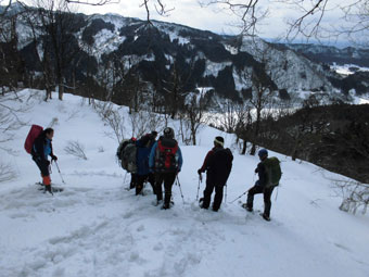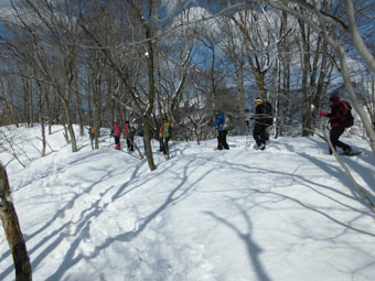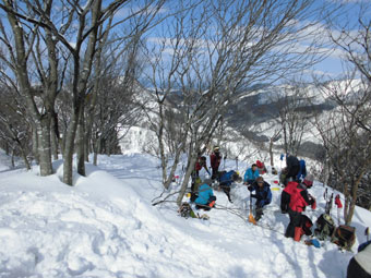 12名の参加者の殆どが、初めてのルートだけに、「素晴らしい!」 の連発が飛んでいた。それもその筈、大倉山や毛勝の山々だけでなく、剱岳がずっと望めるからに他ならない。また、杉よりも雑木が多く、雰囲気がとてもいいのであった。