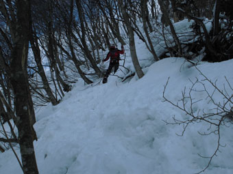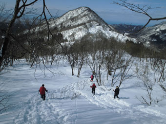 山頂から、スキー場への急斜面を降りる。