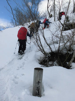 2/19 夜中に咳が出ていて、「ちょっと、まずいかな!」 と思ったが、結局はハレルヤに参加した。あまりお天気が良くないとの予報であったが、良い方に転んで、山行は楽しいものになった。幹事の池田氏の企画は、赤谷ノ頭に繋がる尾根の770mピークまで行って、後に千石城山の頂に戻り、スキー場に降るというものだった。