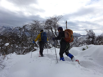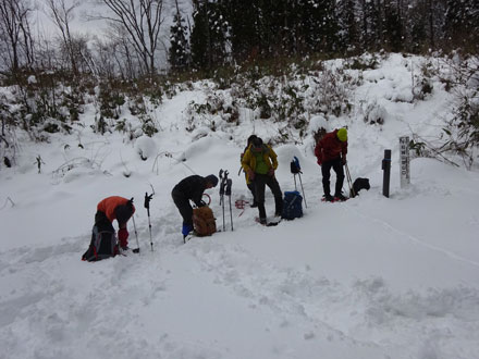 | 通常の登山口に着き、カンジキ・スノーシューを外した。 |