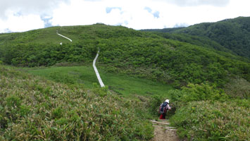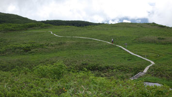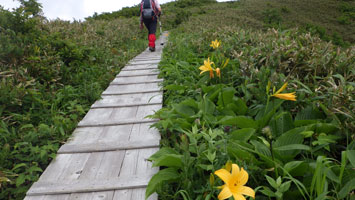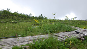 風衝地帯の山頂でも、ブヨを含む虫に悩まされ浮島へ急いだ。ニッコウキスゲの見頃は、まだ一週間も10日も先のように思えるが、チラホラと咲き始めており、それなりの雰囲気は醸し出されている。ササユリも、その順番を待っているようであった。