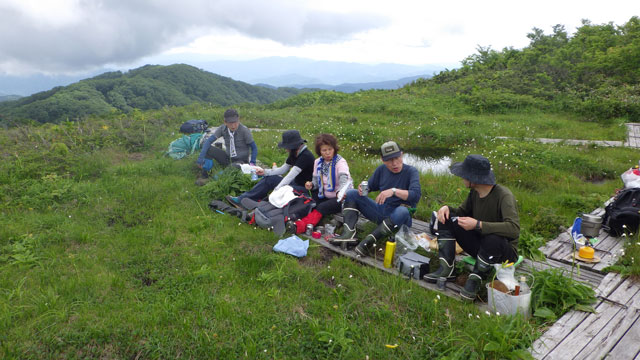 一時を過ごし、山頂へ向けての木道歩きに、ねぎちゃん夫妻と遭遇。一旦は、「またね!」 と別れをしたが、山頂直下で、北ちゃんと田村氏と、またまた遭遇。こうなれば、もう一度浮島に戻らなければなるまい。54回目の白木峰で、浮島に2回も行ったのは今回が初めて。でも行って(戻って)良かった! 久しぶりに会えた方もあり本当に良かった。そして、楽しかった。
