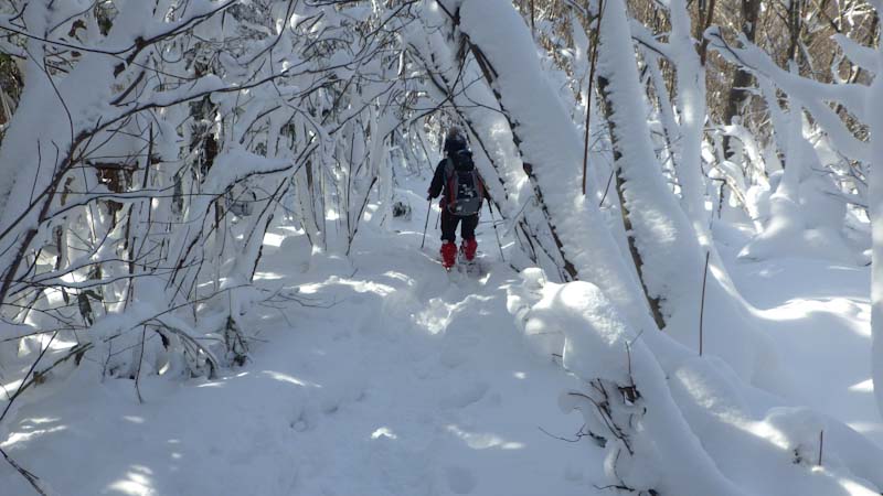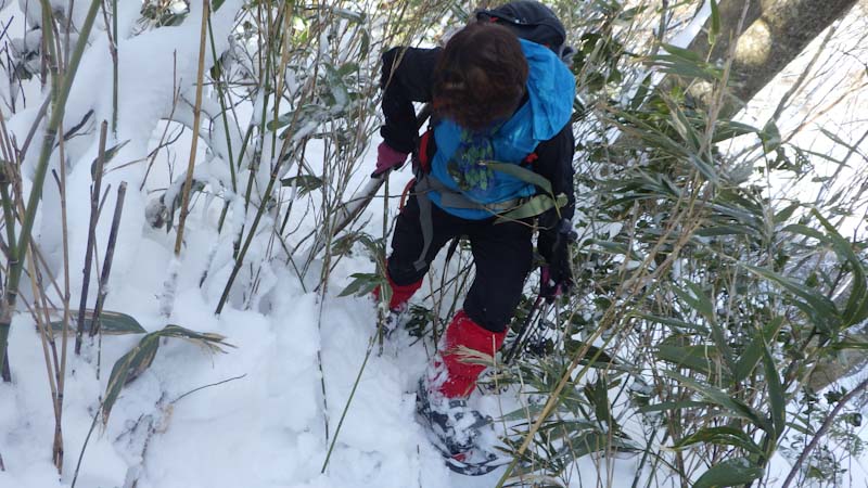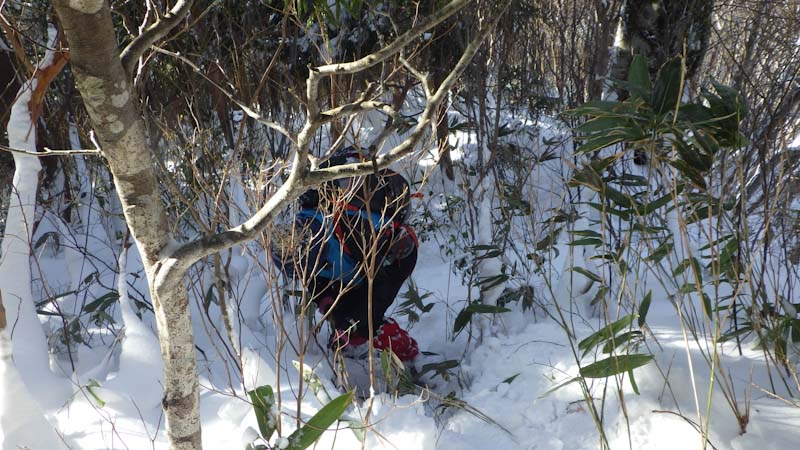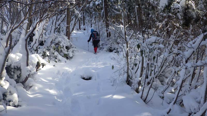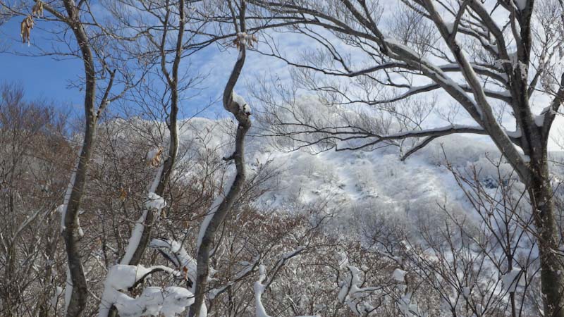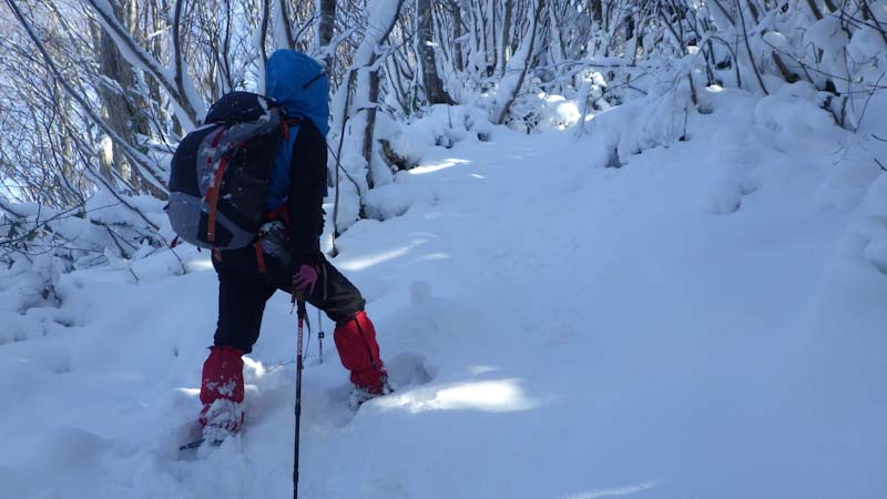登山道に入ってからもしんどかった。第1登山口から第2登山口(標高1,170m)まで2時間近く掛かってしまった。中途半端な雪量がそうさせたのかもしれないが、木々の雪を払い除けたり、それよりも「山ノ神」の足が上がらなかったのが一番だったろう。