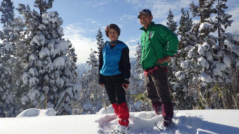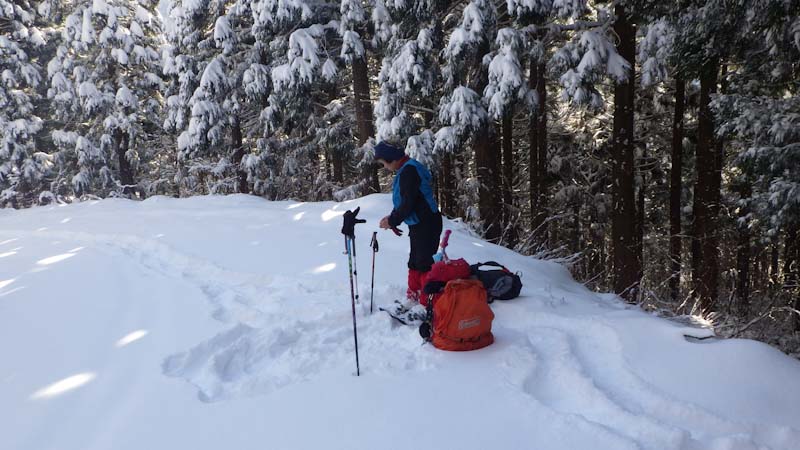 その広い登山口で、ベンチ・テーブルを造って一時を寛いだ。少しの余裕時間(山ノ神が飲んでいる時間)にブナ林へ向かって歩いたものの、深雪と木々に邪魔されて、すぐに撤退を決め込んだ。