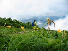ヘリポート付近で、白木峰がどんな所か調べに来たという熟年の夫婦に、“ニッコウキスゲの群生している所は何処か?” と尋ねられた。車の行ける所までのつもりで来たのだが、ついつい上まで来てしまったと言う出で立ちは、背にも手にも何一つない格好であった。恐らく一面がニッコウキスゲに埋め尽くされている期待を持っておられたのだと思うが、頂上まで行って来たのだと言われては、あそこが咲いている所だとは言えなかった。