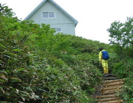 「あれは仁王山?」「いやもっと右奥だよ!」などと、残雪期に二度登った事のある山だけに、他の山とは違った思いがある。右にカーブする所に、ニッコウキスゲの黄色の固まりが見えて来ると、その左側上に白木小屋(白木峰山荘)がある。
