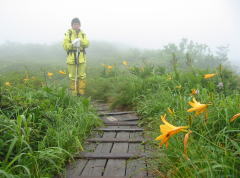 今日も誰もいない霧雨の中の山頂で、意外と少ないニッコウキスゲに驚いたが、ギボウシとササユリだけが目立ってしまった。