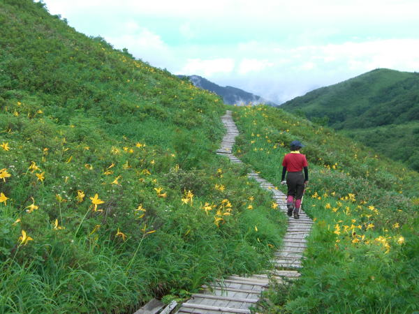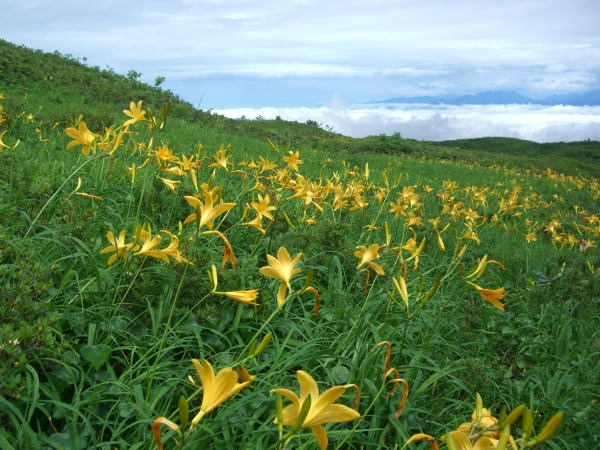 朝起きても雨。それでは、「ニッコウキスゲの名残でも、 見に行くか!」 程のつもりであったが、意外や意外で、 予想を遙かに超える黄色の群落に驚いた。