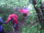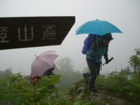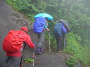 | スタートから雨 | 始めは急登 | 大方は、傘を差しながら・・ | 1回目の林道に出る |