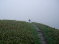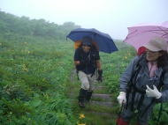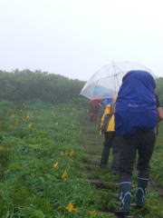 | 林道から登山道へ | 雨でも、何だか楽しい | 雨に濡れたニッコウキスゲ | 三分咲きの中を・・ |