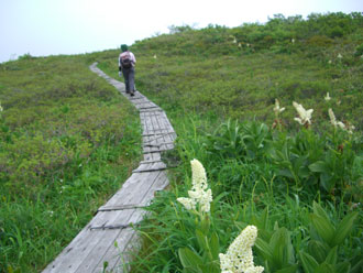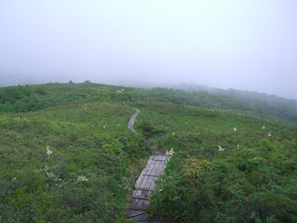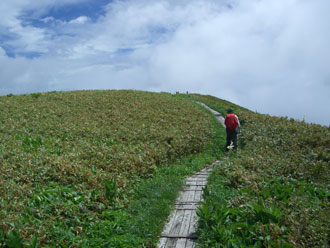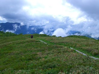 山頂付近の風衝草原を行く。