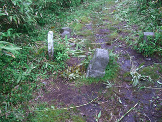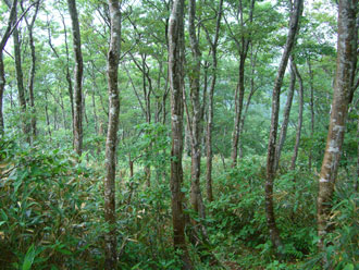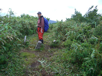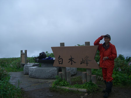 小白木峰の先に、二つの地塘があるが、そこの方が、小白木峰の山頂の雰囲気を持っている。雨がザーッと降ったり、ヒューッと風が吹いたりするものの、時たま何もなかったように止んだりする。「午後から強雨」 の予報もあったが、ここまで来たら、小白木峰の登山口まで行ってやろうと思った。滑らないようにと思ったが、やはり一度だけ変な転び方をした。でも、機転を利かせた転び方だったので、傷もせず、着衣も汚さなかった?