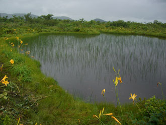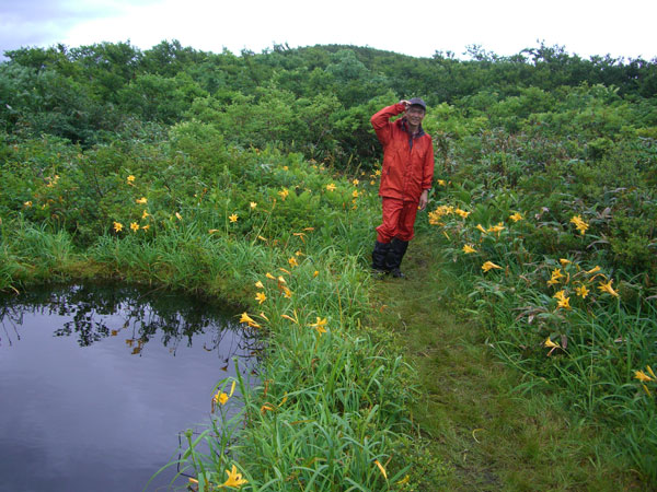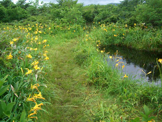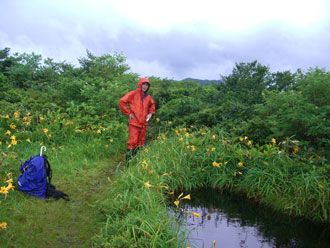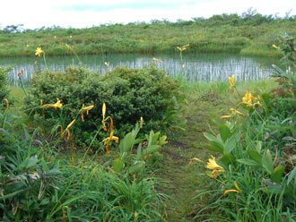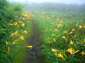 先週よりは、ちょっとばかりニッコウキスゲの盛りが過ぎたかに思えたが、まだまだ例年より数多く咲いている状態であった。白木小屋周辺、そして、山頂から、今も真っ黄色な風衝草原を眺めたが、今日は木道の続く浮島へ行くのを止めた。