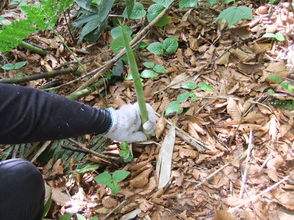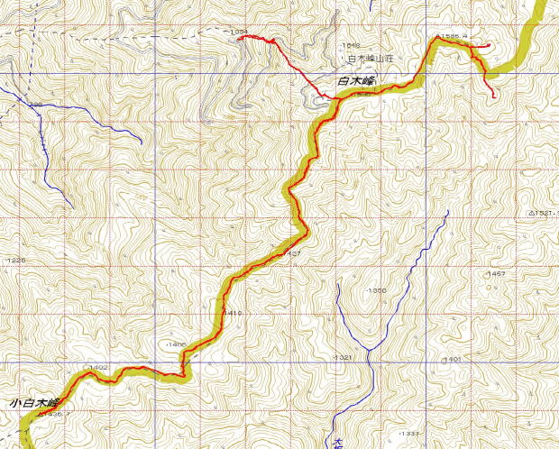 | 1300P駐車場から登山道へ。白木峰を通過し、前白木峰に向かったが、 予想以上のヤブに撤退。浮島で小休憩し、再び白木峰を通過し、小白木峰に向かう。 ススダケ採りに熱中したせいで、小白木峰での休息は僅か。 重荷を担いで駐車場に戻った頃は、午後5時をとっくに過ぎていた。 |