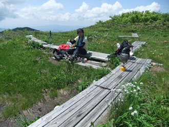 ヤブの苦手な我々は、ギブアップし、前白木峰のピークも諦め、浮島に難を逃れた。暫しコーヒータイムとして身体を休め、小白木峰を目指す事にした。しかし、山菜採りの好きな 「山ノ神」は、ススダケが気になり、なかなか前には進まなかった。