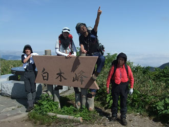 北ちゃん・ねぎちゃん・田村氏の3人は、もちろんススダケ狙いで、今回は前白木峰方面に行くと言う。ならばと、我々も同行を申し出て後に着いた。しかし、前白木峰への道は、何時になく、凄いヤブで、登山道が不明瞭であった。しかし、猛者の3人は、そのヤブを掻き分け、ここぞとばかりに消えて行った。