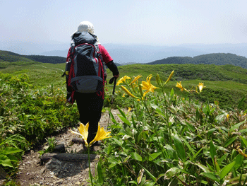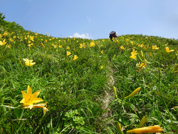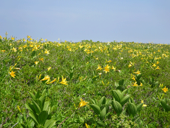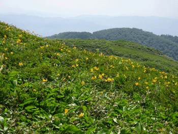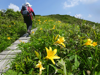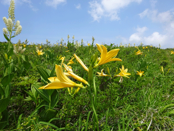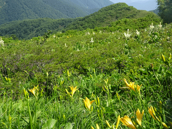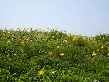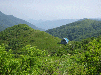 | ニッコウキスゲが現れました。 | 白木小屋(避難小屋)が見えます。 |