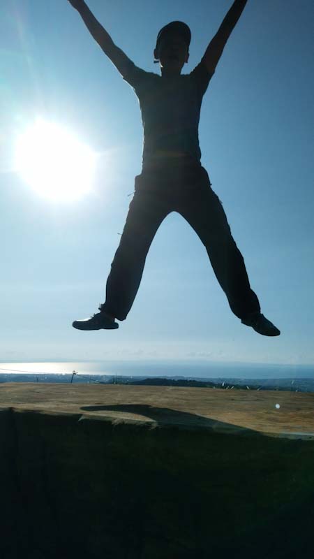 | 下山後、4週間前に忘れて来た孫のトレッキング シューズを探しに嘉例沢森林公園へ行った帰り、 大理石テーブルでバンザイをしたのでした。 (善意に感謝の意を込めて) |
