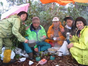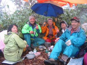 感激の対面で意気投合したというものの、せっかく美味しい食材を担ぎ上げられたのに、私達までご相伴に預かる事になってしまった。シュンちゃんの持ち込んだ大きなツエルトをタープに張り、楽しい雨中宴会となった。