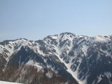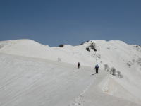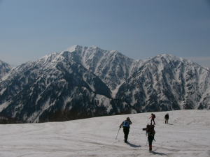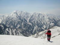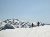 成谷山(1,600m)付近からは、木々もなくなり、アルペン的な様相になる。毛勝山や駒ヶ岳を眺めながら、贅沢にもサンナビキ・滝倉山の奥に、薄っすらと後立山の山々が浮かび上がって来る。