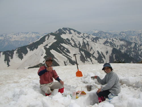 毛勝山を眺めながら、また駒ヶ岳に見とれながら、雪のベンチに腰を降ろし、まずは乾杯である。