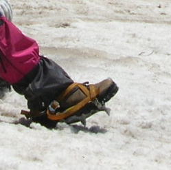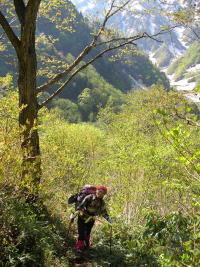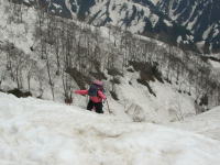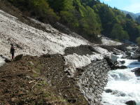 片貝山荘(片貝川第5発電所)までの林道のデブリは凄まじく、これでは、なかなか林道の整備が出来ないのではと思ってしまった。片貝山荘から東又登山口までのデブリも、黒々と大きいものであったから、「山ノ神」には、ピッケル・アイゼンを用意させ、装備を取られた私は、ストックをシャベルに換えて歩き始めたのであるが、取付いてみると、片貝川に直接落ちるような恐怖感がなく、意外とスムーズに渡れたのである。