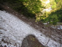 今日は、「好山病・・」と離れて、二人だけの山行である。二人だけだと気が緩むのであろうか、やっぱり出発が遅れてしまった。GW明けに、片貝川第2発電所ゲートが、ようやく開いたようなので、成谷堰堤まで行けると思っていたのであるが、その手前300mの所で雪のためストップであった。