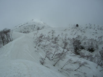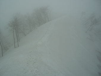 尾根の北側は、ズタズタに大きく亀裂が入り、イヤな感じであったが、南側は雑木があり恐怖感はない。唯、この尾根筋は、冬期に一部の岳人達が入り込む以外、あまり利用されていないだけに、何と言っても「熊」がイヤであった。見通しが悪く、一人であるから尚更であった。