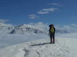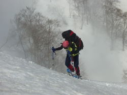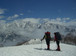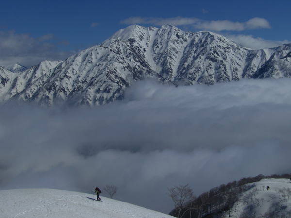 4/20 ガスに覆われても、青空の勢いは強く、すぐに視界を広げ、先鋭な山々が、尚一層際だって見えた。シャベル・三脚・ピッケル2本・スノーシュー2ヶを、ザックに括り付けると凄い形になった。
