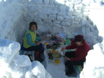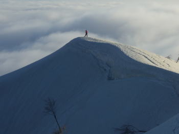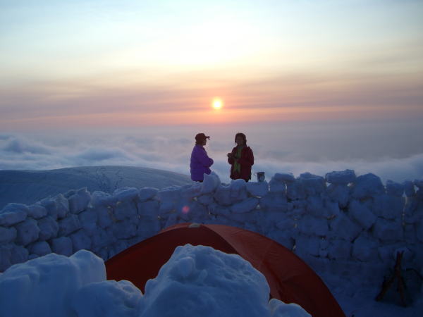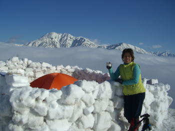 歩き始めて8時間、テン場を稜線に求めた。より展望を求めたかったからであるが、夜間になってからの強風には、今にも飛ばされそうで、なかなか眠れなかった。その風の威力は凄まじく、骨抜きと言えば良いのか、それとも骨粗鬆症のようであるといえば良いのか、高く積み上げた雪のブロックを溶かしてしまうのであった。