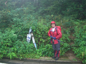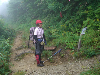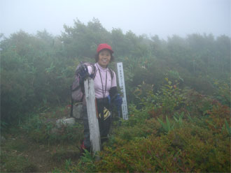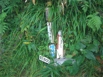 「1時間もあれば、何とかなるであろう。」 と思っていたが、またまたガスに覆われてしまった。草木は伸びていたが、真新しい中部森林管理局の境界見出標が案内してくれた。小杉谷への分岐を過ぎ、少し登り返した地点で、午後4時半。
