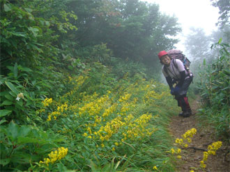 9/22 昨日の今日で、ブナクラ行きに山ノ神が渋った。夕方もしくは夜から晴れの予報であったが、出掛けから県西部は雨であった。山ノ神の「駒ヶ岳の山頂を踏んだ事がない。」 「駒ヶ岳の山頂から剱岳は見えるのか?」 から、僧ヶ岳・駒ヶ岳行きとなったのであるが、今日も出足が悪い。当然、ラッシュに引っ掛かり、高速を利用しても、登山口の烏帽子口発が午前9時50分であった。暑さで、すぐに雨具を脱ぐ羽目になったが、視界は全くない。おまけに足取りが遅く、山頂着が午後0時20分になってしまった。