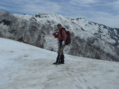 5/5 このところ、4月の僧ヶ岳に拘っていたのであるが、3年ぶりに5月にも登る機会を得た。真っ白な雪の僧ヶ岳でなくとも、小さな高山植物や桜(花吹雪)も乙なものである。そして、標高1300mからは、しっかり雪が残っているのであるから・・・・・ その雪は、黄砂で汚れても、また新たな雪に覆われて、そしてまた溶けて、そのコントラストがまた絵になる?ような気もする。