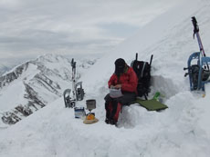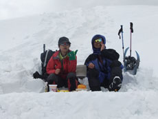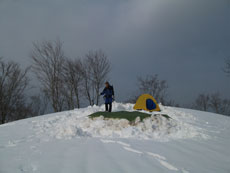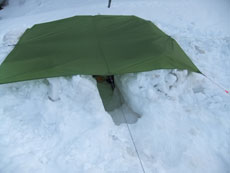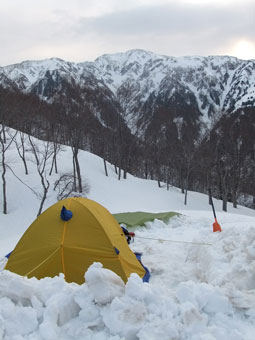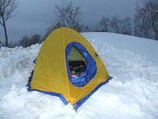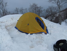 | タープを利用した食事処。 | 雪山で初めて使用した3〜4人用テント。 | 広くて快適です。 |
