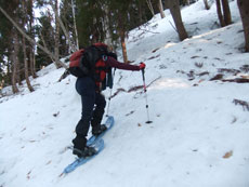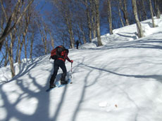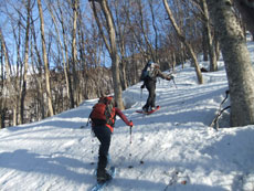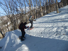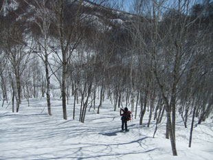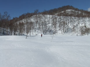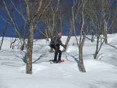 | 大展望を眺めながら、横岳に向かってスタート。 | クラストした斜面を降るのに、おっかなびっくりの「山ノ神」 |