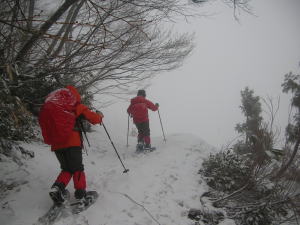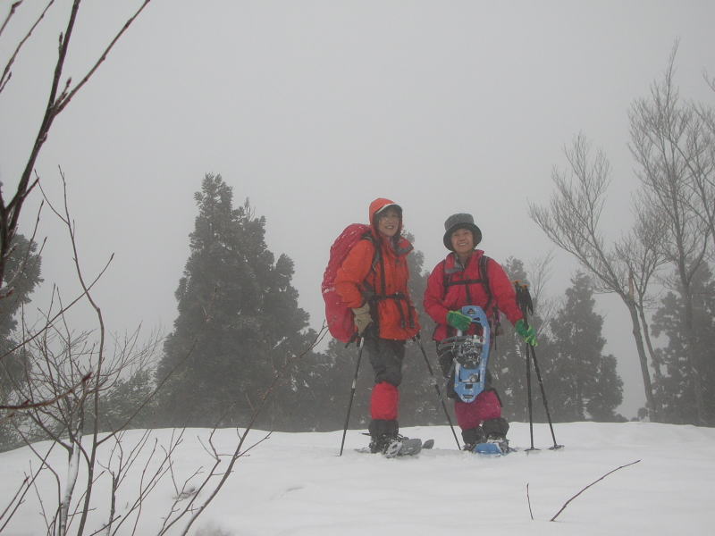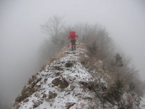 小雪が降り、全く視界が利かない山頂で、
