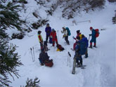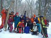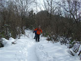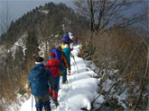 | 食事を終えて記念写真。 | 鳥越峠に向かって撤退開始! | 細尾根を行く。 | 前方は高峰山。 |