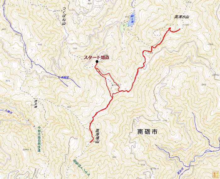P9:35=登山口9:40=高落場山と高清水山の分岐10:30=高落場山頂上(10:35~11:05)=林道への分岐11:40=高清水山登山口12:00=オエズコの頭12:20=高清水山頂上(12:35~13:25)=登山口13:50=車デボ地点14:30