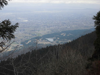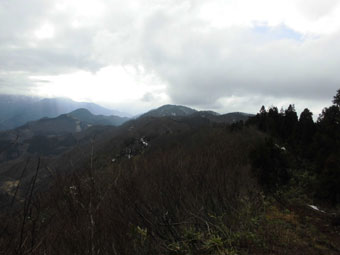 遠くに平スキー場(左)と高落場山を眺める。 |