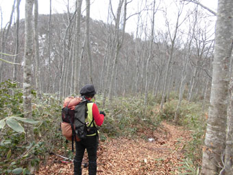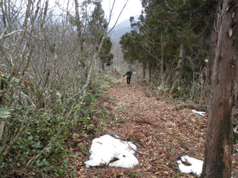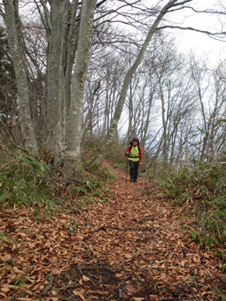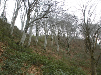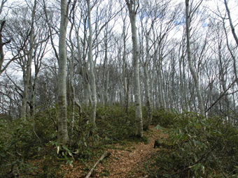 予想以上に雪が無く、そのお陰で、ブナの落葉をぬかるむ事なく、快適に踏む事が出来た。この辺のブナは、大木ではないが、気持ちよい程に、その林が続いており、最近はよく利用するようになった。1時間もあれば、山頂に達する事が出来るのであるから・・・