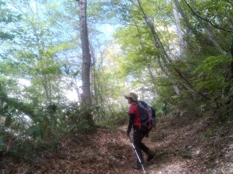 時折、スーッと風が抜けると、「気持ちいい。」 となった。そして、新緑がとてもキレイである。ブナ林は特にキレイ。喘ぎ喘ぎの「山ノ神」であったが、山菜を見付けると元気が出るオカシナ人である。でも、何やかんやと言っても山頂に辿り着けるのであるから、それはそれで良し。