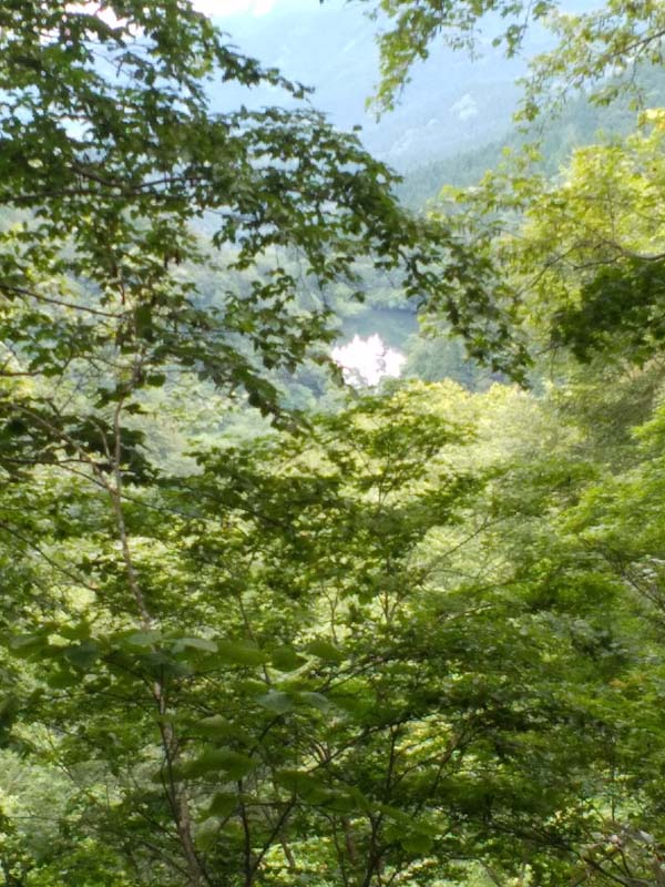 | 樹木の間から縄ヶ池を見下ろす。 |