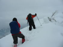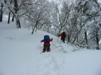 唐木峠から15分程進んだ833m付近で休憩とした。「後、300mを切ったね。」と励ましながら先に進むが、雪が本格的に降り始め、また、急登場面から流石の「シュンちゃん」も、たまらずスキーをデボした。