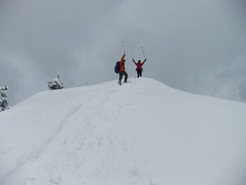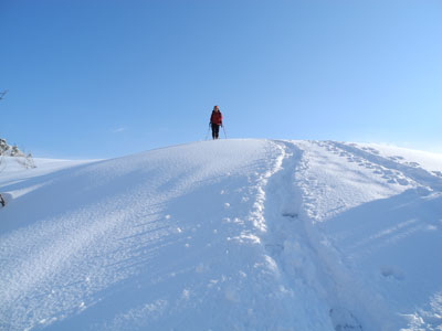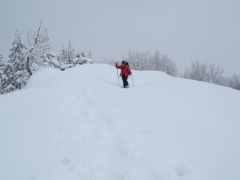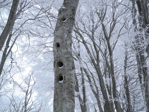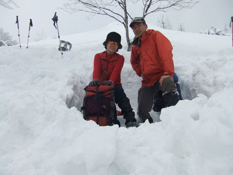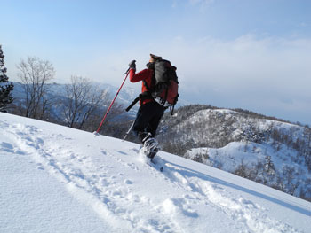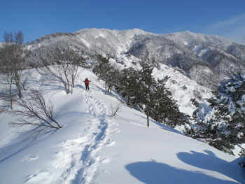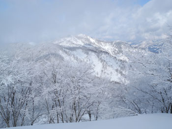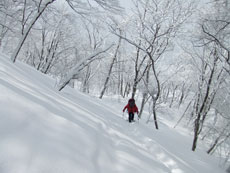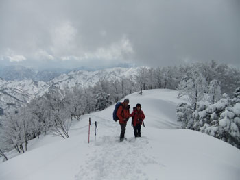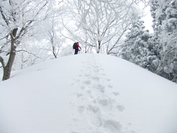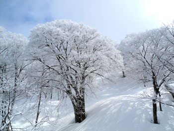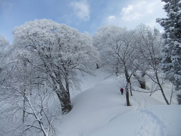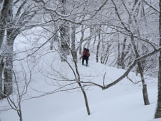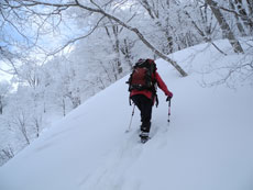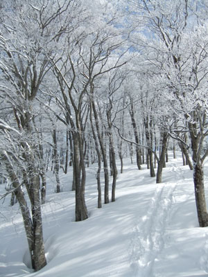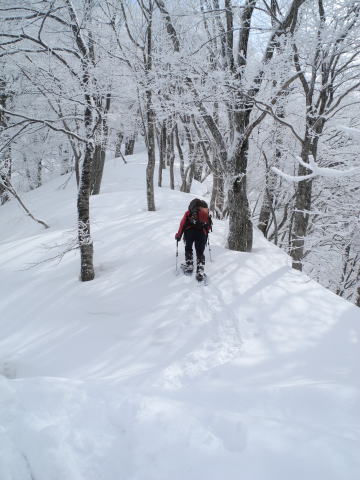 でも、吹きさらしの所とか、高所になると、真新しい雪上を歩く事が出来、気持ちの良い登高となった。しかし、急登場面になると、カチカチ雪上にサラサラ雪が乗っかった状態で、アイゼンやピッケルが欲しいくらいであった。片斜面では、「山ノ神」がビビッタが、ブナ林に達してからは、そんな事は忘れてしまったように、気持ち良く歩いていたように感じられた。