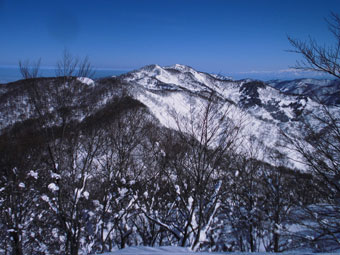 山頂付近から高清水山を望む。 |