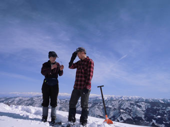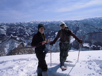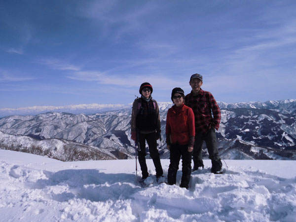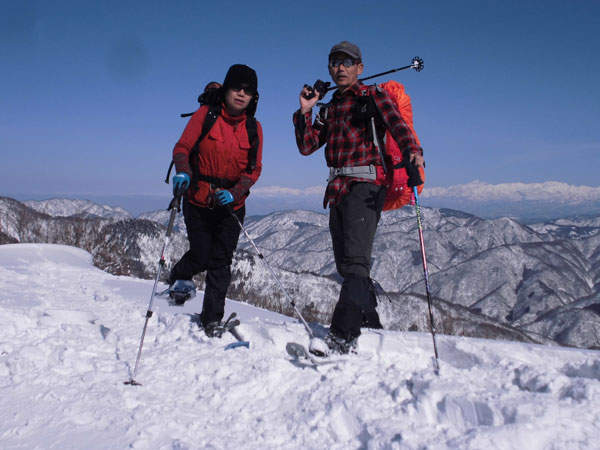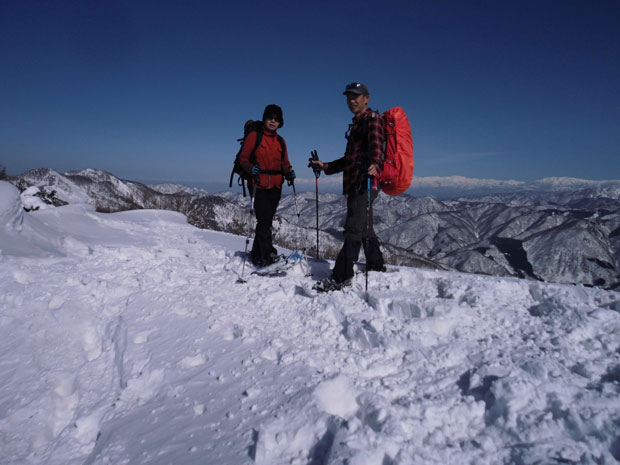 2/16 スタートが遅くとも、前日の?、そして、先行者のトレースに助けられ、難なく高落場山の山頂に辿り着く事が出来た。素晴らしい展望が飛び込んで来たところに、「一人?」 と声を掛けられた。「えぇ~」 と思ったが、俵先輩だった。何年ぶりだろう。
