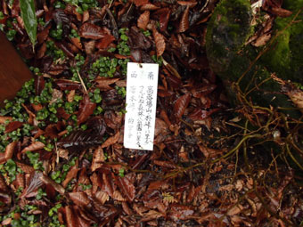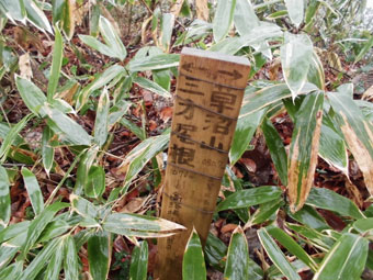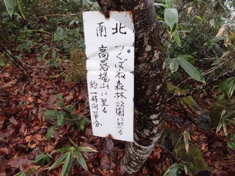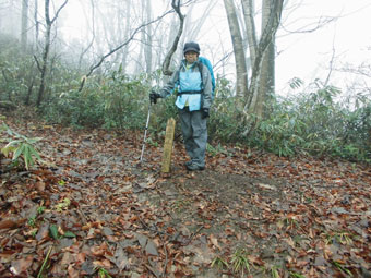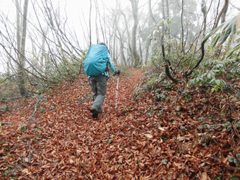 小さなアップダウンはあるものの、取り付き地点から山頂までの高低差はあまりなく、気持ちのよいブナ林の中を歩くのである。落葉を踏みしめて歩くのは気持ちのよいものであるが、私達は、濡れた落葉の上を歩くのであるから、時たまツルッといきそうになる。